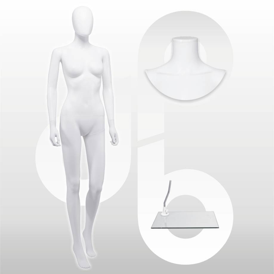 Goedkope dames mannequin, afneembaar hoofd, polypropyleen, wit mat, verwisselbare halsdop en abstract ballonhoofd, rechthoekige glazen voetplaat met kuitpin.