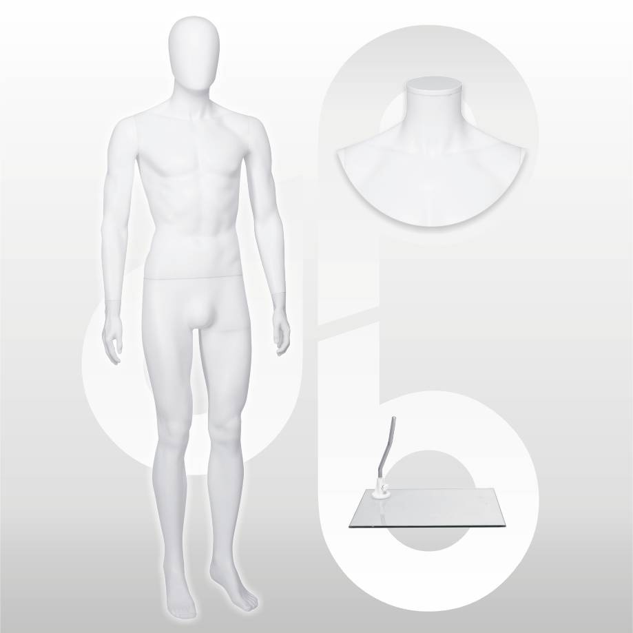 Goedkope heren mannequin, afneembaar hoofd, polypropyleen, wit mat, verwisselbare halsdop en abstract ballonhoofd, rechthoekige glazen voetplaat met kuitpin.