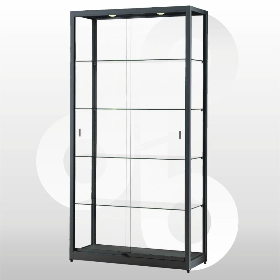 Vitrinekast 100x40x200 v.v. rondom gehard glas, 2 schuifdeuren met slot aan de voorkant, 4 in hoogte verstelbare legborden (6mm) en 2 x 7 Watt LED-verlichting in plafond. Uitvoering: geanodiseerd zwart haaks profiel.